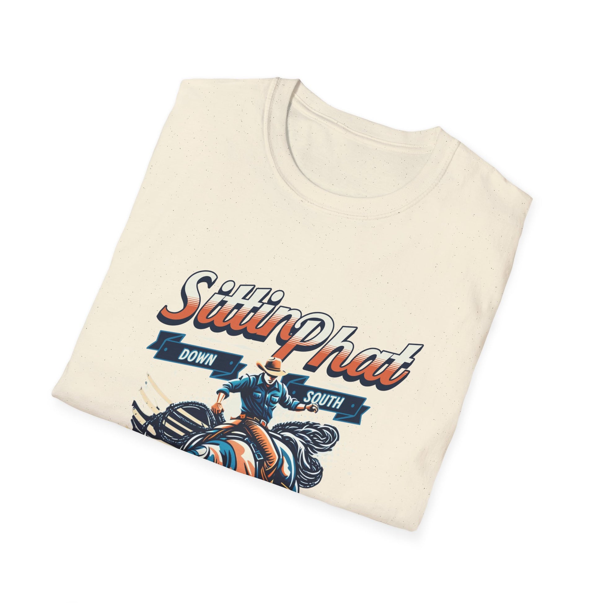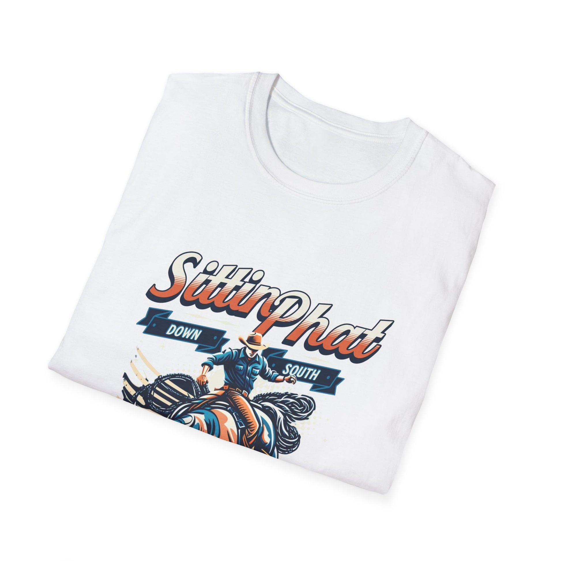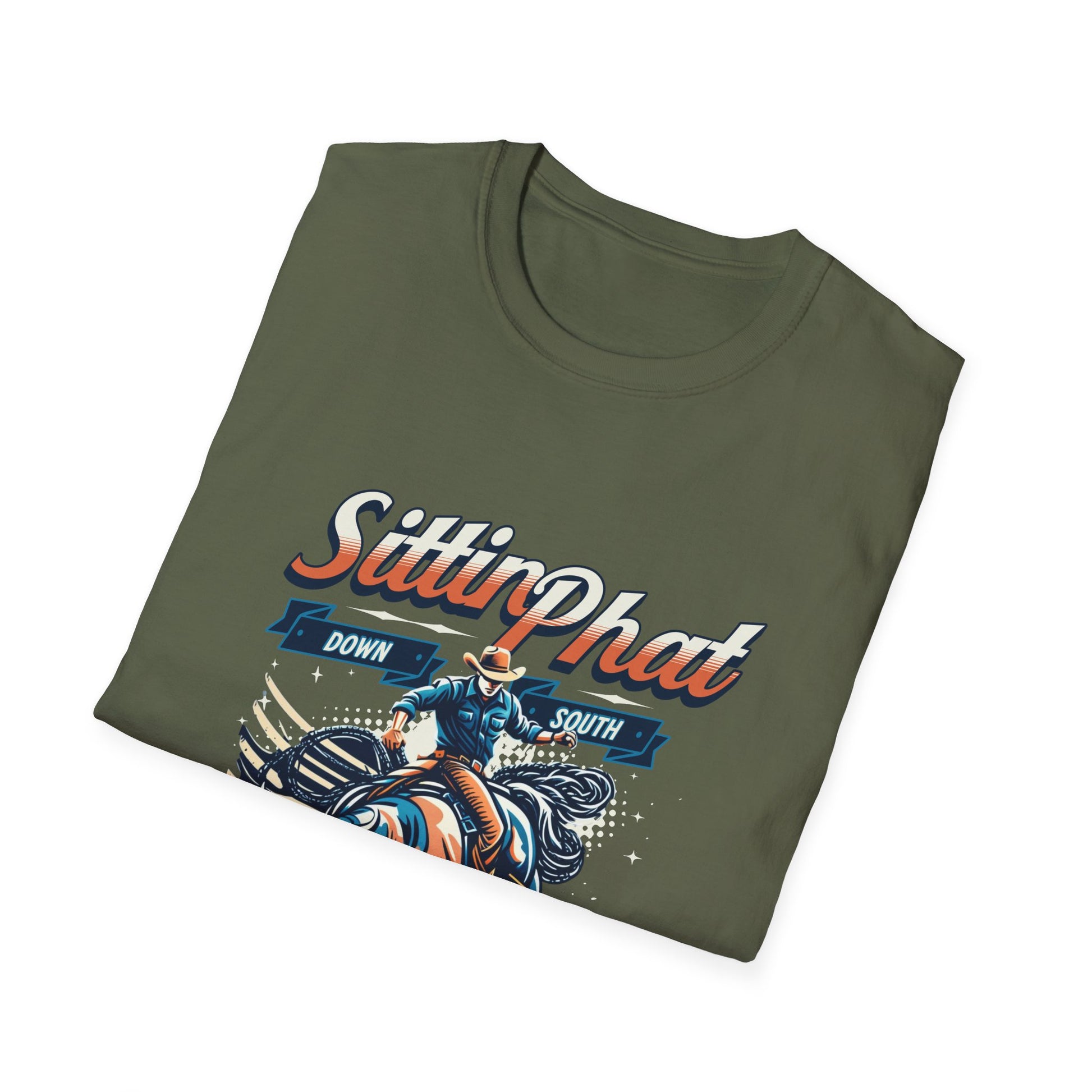This T-Shirt features a cowboy at a rodeo riding a bull with the slogan, 'Sittin Phat Down South' on it. It exudes a rugged and adventurous vibe, perfect for those who enjoy Western culture and rodeos. Ideal for fans of bull riding and country living, this T-Shirt is great for casual wear or as a statement piece for rodeo events and country music festivals.