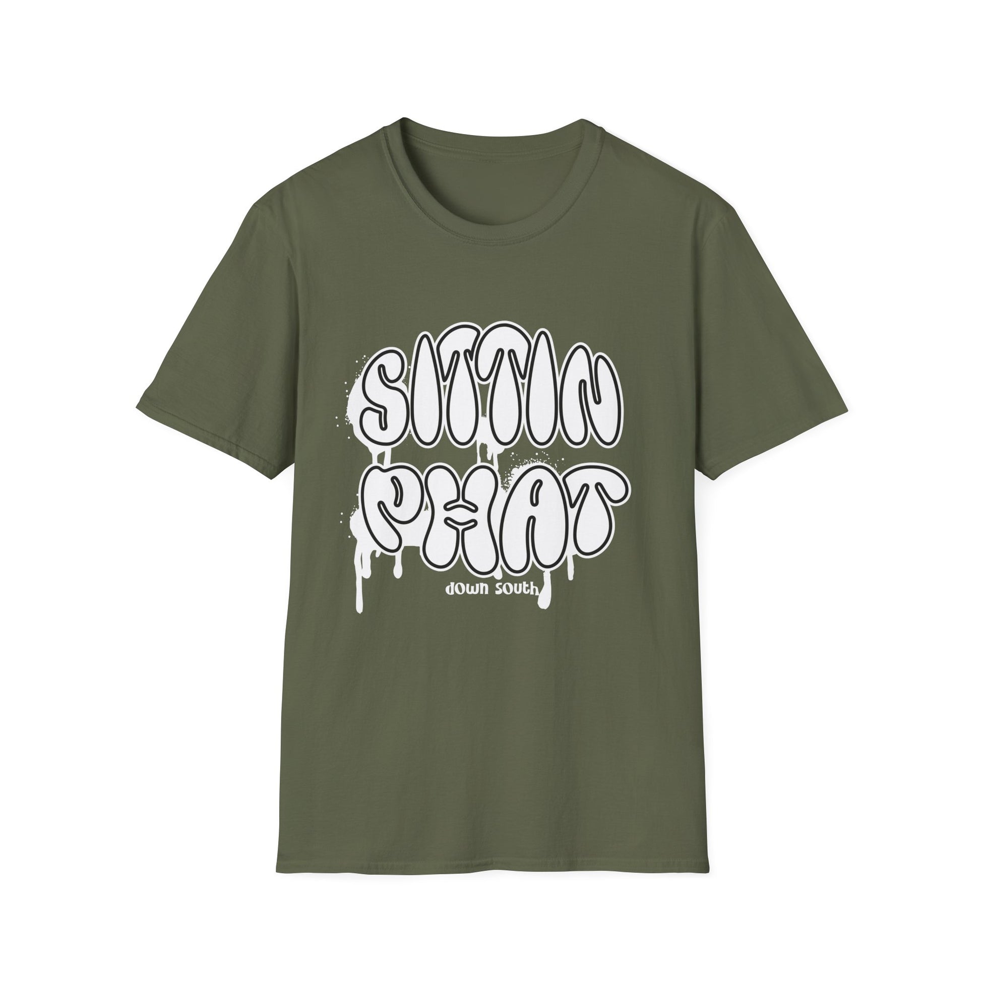 Sittin Phat Down South Retro, Drippy, Graffiti Unisex Softstyle T-Shirt. Rep your cool, urban vibes with this fun branded T shirt.