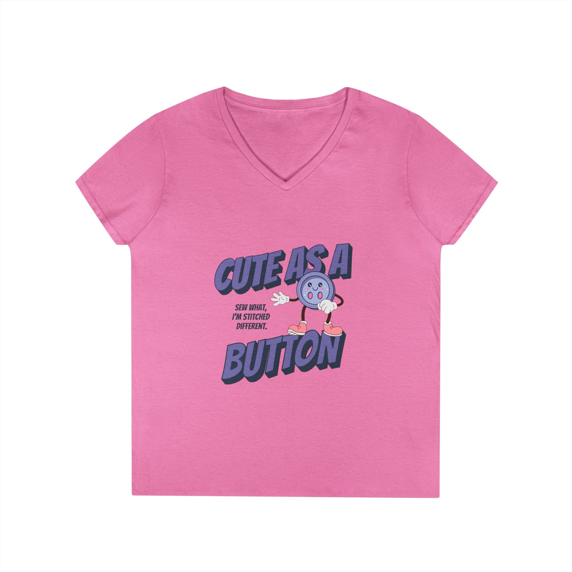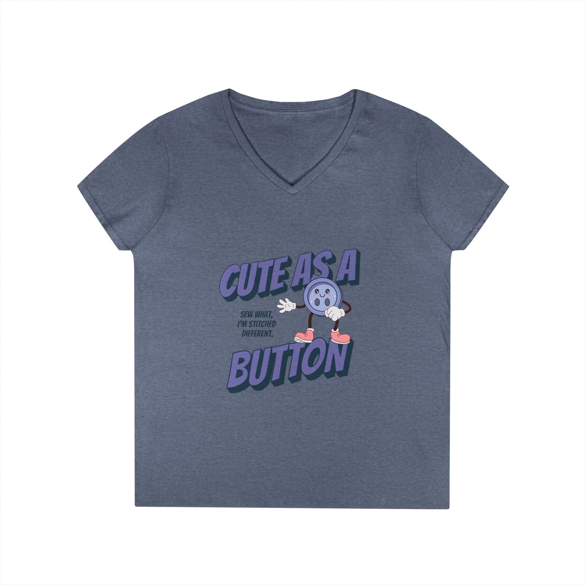 A cute as a button ladies' V-Neck T-Shirt featuring a retro button character and the phrase 'sew what, I'm stitched differently'. Perfect for those who love quirky and unique fashion pieces. This T-Shirt is ideal for casual wear and makes a great conversation starter. It is relevant for craft lovers, seamstresses, and those who appreciate creativity. Suitable for everyday wear, as well as craft-themed events and gatherings.